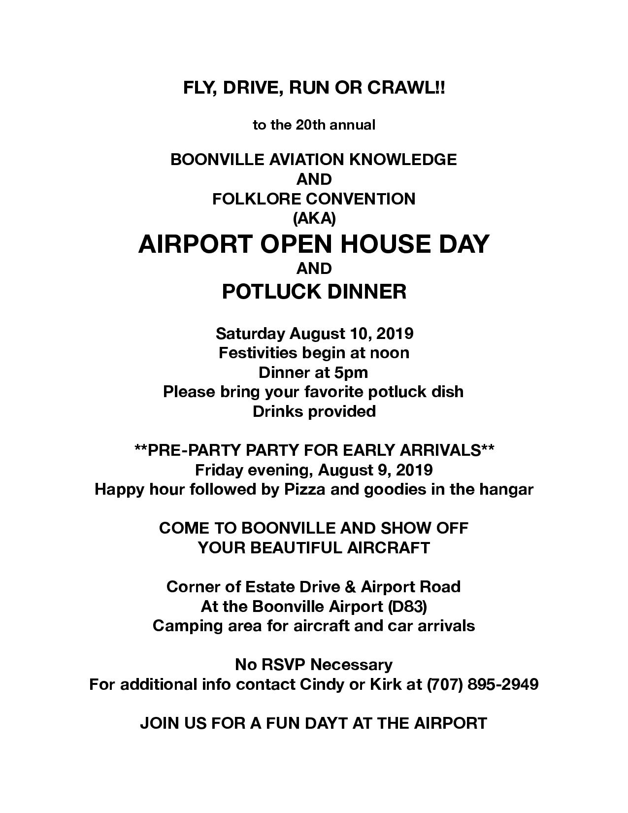 - Boonville Airport: Third Saturday of each month from 11 a.m. to 3 p.m. Call (707) 895-2949 for information.