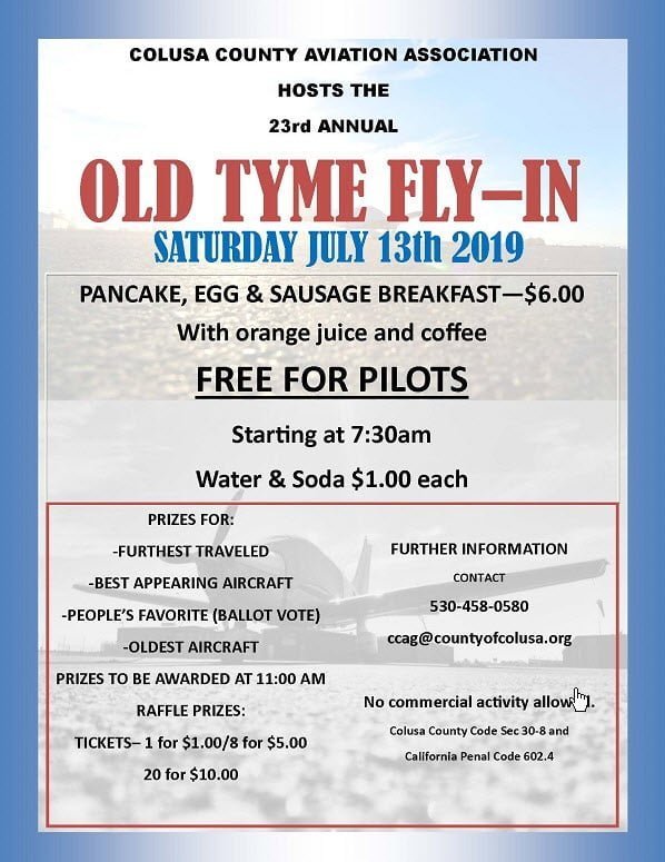 Join EAA Chapter 1027 for a fly out to the 23rd Annual Colusa Old Tyme Fly-in!